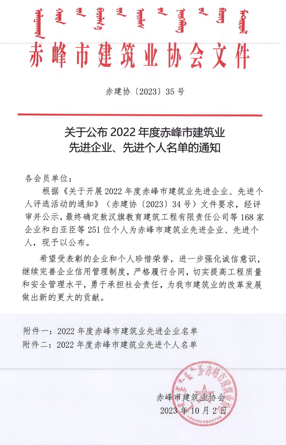 根據(jù)《關(guān)于開展2022年度赤峰市建筑業(yè)先進(jìn)企業(yè)、先進(jìn)個人評選活動的通知》(赤建協(xié)(2023)34號)文件要求,經(jīng)評審并公示,最終確定中環(huán)恒灃建設(shè)有限公司為赤峰市建筑業(yè)先進(jìn)施工企業(yè)、質(zhì)量管理先進(jìn)企業(yè)和安全生產(chǎn)先進(jìn)企業(yè)。中環(huán)恒灃建設(shè)有限公司張曉茹、趙新朝、徐曉麗和王道軍為先進(jìn)個人。
