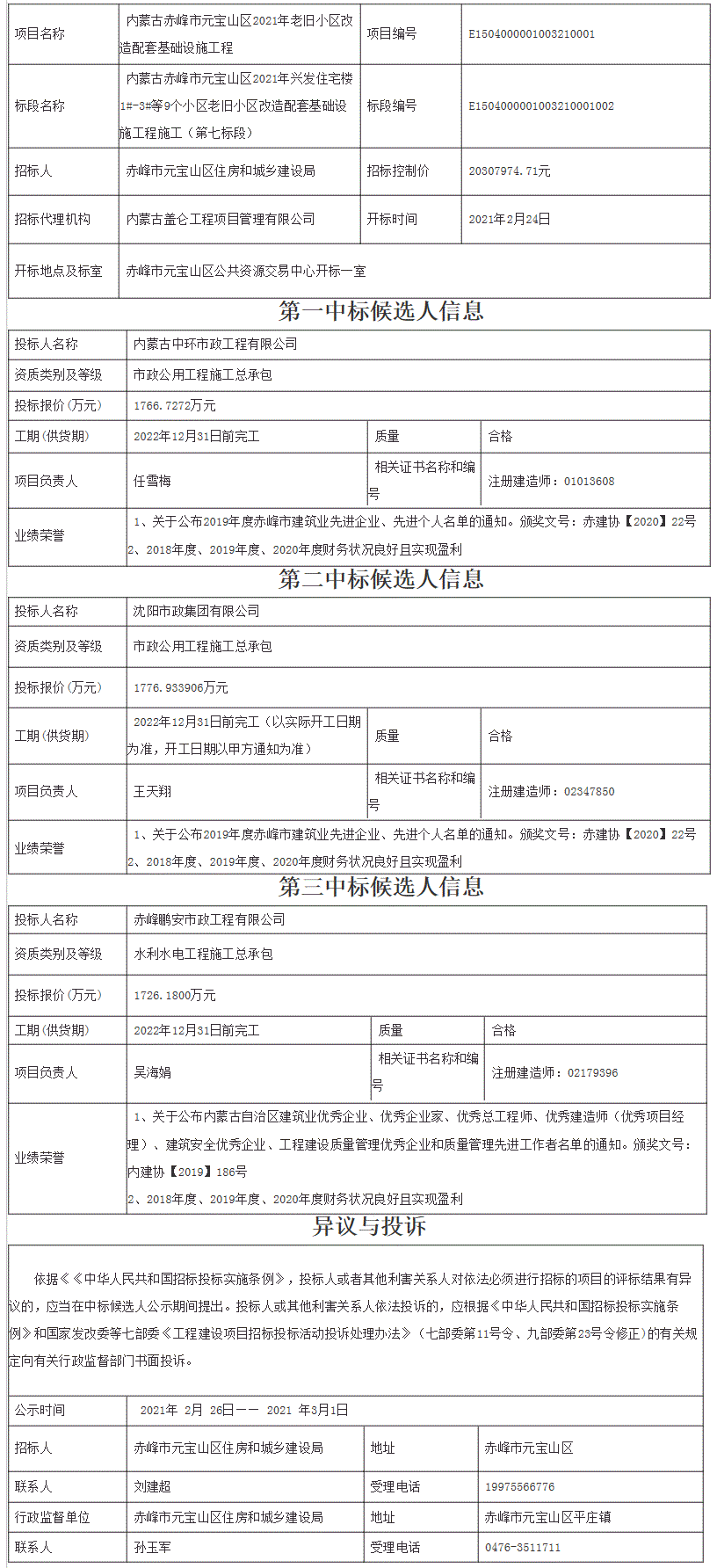 內蒙古赤峰市元寶山區(qū)2021年興發(fā)住宅樓1#-3#等9個小區(qū)老舊小區(qū)改造配套基礎設施工程施工(第七標段)招標評標工作已結束,依據(jù)評標委員會的評標報告,發(fā)布中標候選人公示如下: